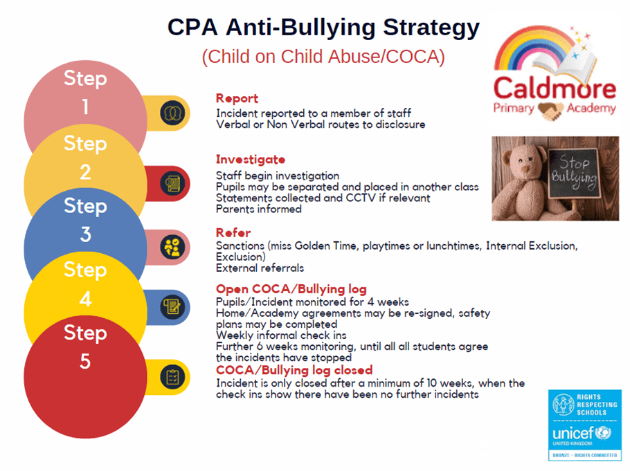 All members of Caldmore will be encouraged not to accept bullying of any form and if they ever experience, see or suspect bullying is taking place to ALWAYS speak up and TELL someone. ALL OF US WILL LISTEN and ALL OF US WILL ACT by involving appropriate staff.